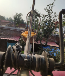 往房頂上吊運玉米時所使用的吊運機為室外吊機,下方是個正方形的底座,壓上配重后就能使用,有的農(nóng)民在吊機上安裝的是手搖絞盤,有的安裝的是電動絞盤,如果用手搖絞盤吊運77筐玉米,平均每次搖手柄50次,總共需要轉(zhuǎn)動手臂3850次,吊運25筐之后需要稍事休息,再上場明顯感覺到手臂累得慌,后來便又重新開始吊運,整個吊運過程雖然比電動絞盤費了力,但是用上半天或者一天時間,也就能吊運完秋收后的玉米。